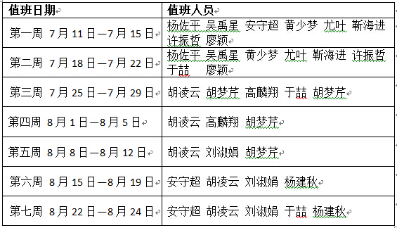 根据学校《关于2016年学校教职员工夏季工作安排的通知》相关规定,结合我馆工作与人员情况的实际,现将我馆暑期值班情况安排公布如下: 1、夏季工作日期为7月11日(星期一)至8月24日(星期三),双休日照常休息。夏季工作期间每天值班时间为:上午9:30—12:00,下午1:00-3:30。 2、值班人员安排情况: